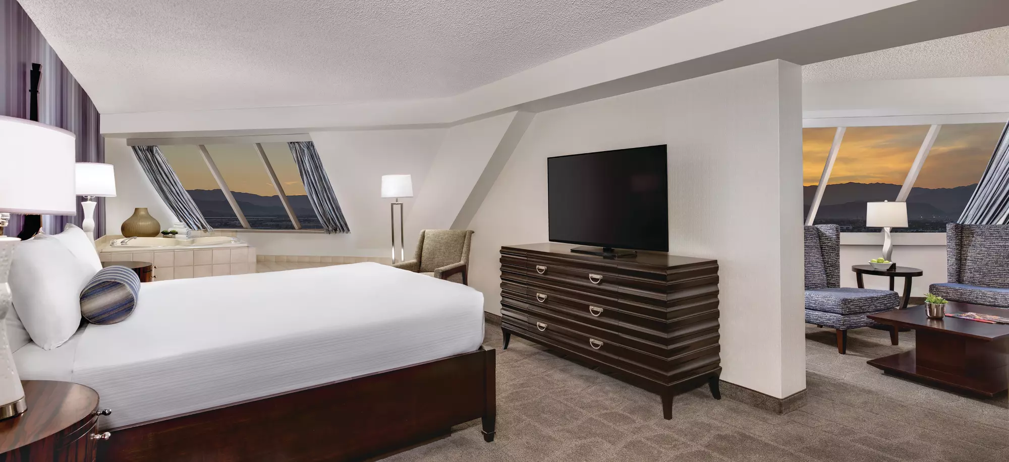 Live like royalty in this king suite. This Pyramid Premier Suite features a soaking tub with a view, adjoining sitting room, and a spacious king bed to unwind.
