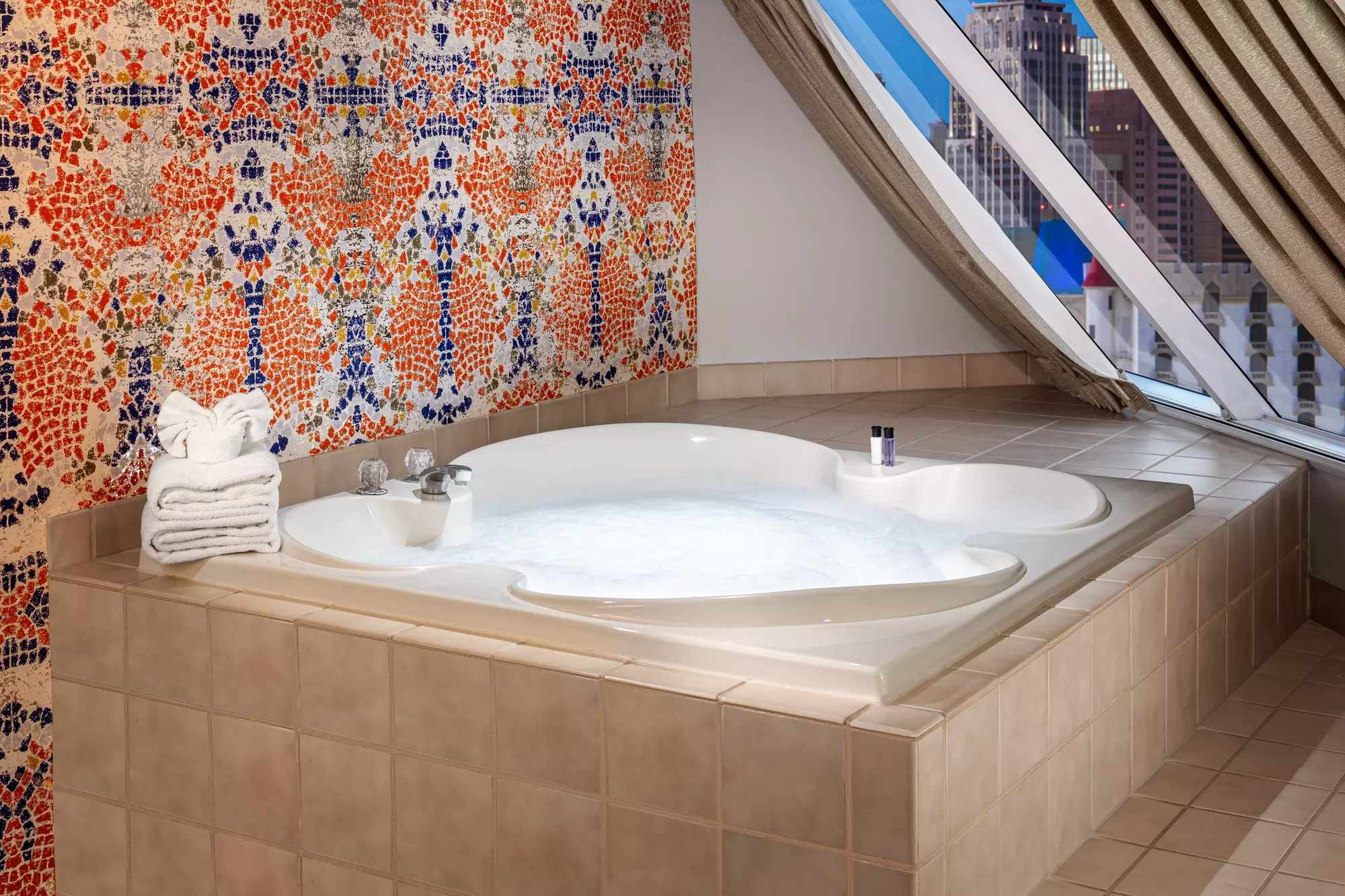 After a sideways ride inside the only inclinator in Las Vegas, set things straight inside a beautiful Pyramid Premier Suite. It features a soaking tub and separate sitting room, and a spacious king bed that await your arrival. Slanted walls give you a true sense of life inside a pyramid while adjoining suites allow plenty of room.