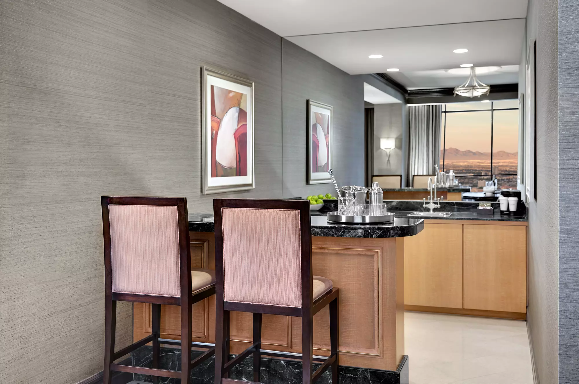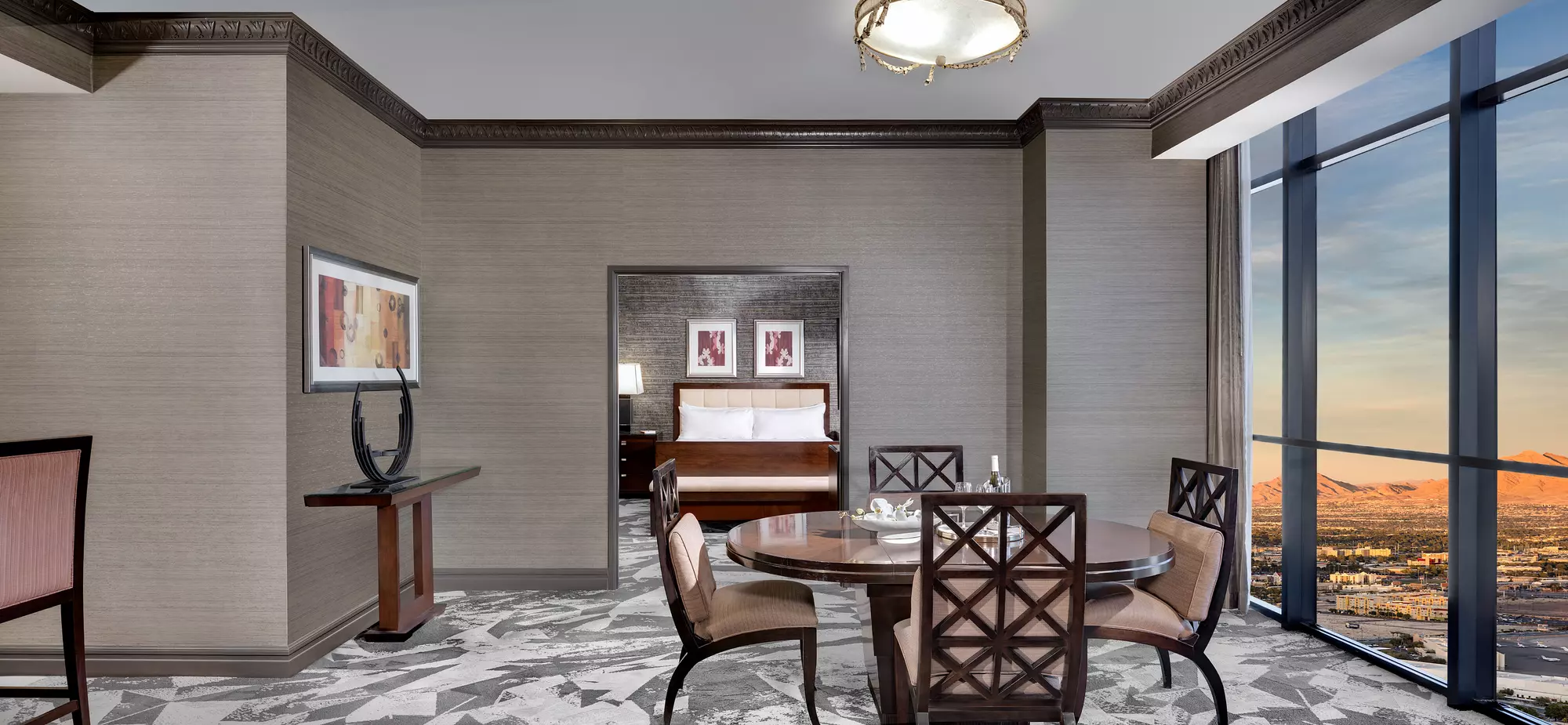 With modern luxuries, this suite boasts a comfortable living room and flat screen TV. The separate dining area complete with a refrigerator, gourmet coffee maker and full wet bar is available for all you entertaining needs. The bedroom has a king bed, separate shower and bath, dual sinks and a vanity space.