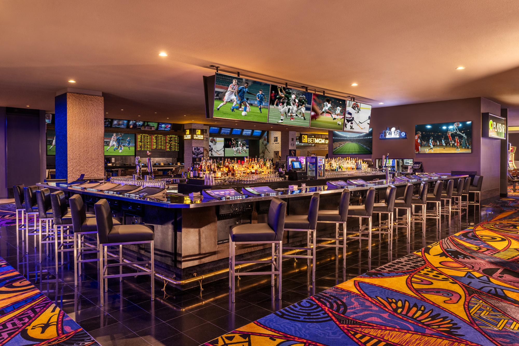 Located adjacent to the BetMGM Sportsbook. Playbar is a destination where guests can enjoy signature cocktails, bar top gaming, and wall to wall big screen sports action.