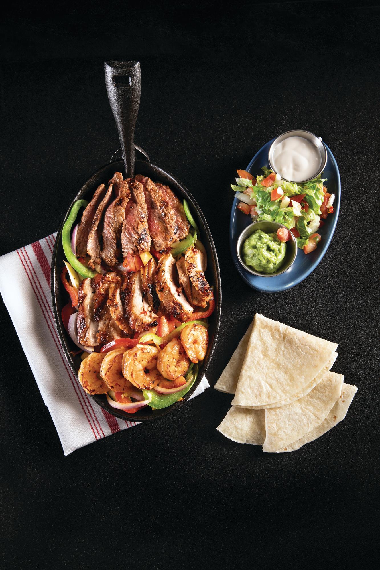 Marinated steak, chicken and shrimp served with rice, beans and tortilla.