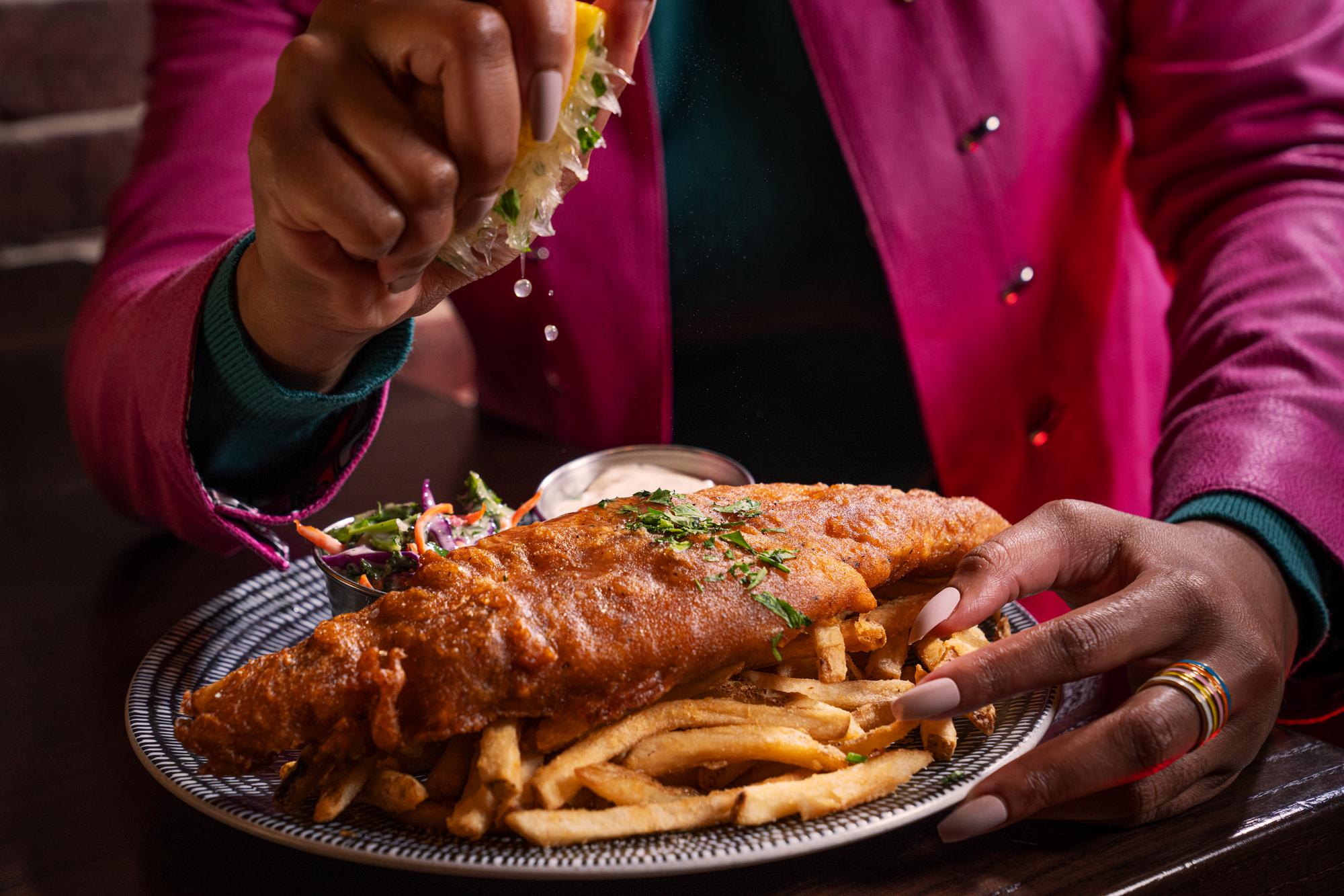 Stout beer-battered white fish, coleslaw, tartar sauce, fries
