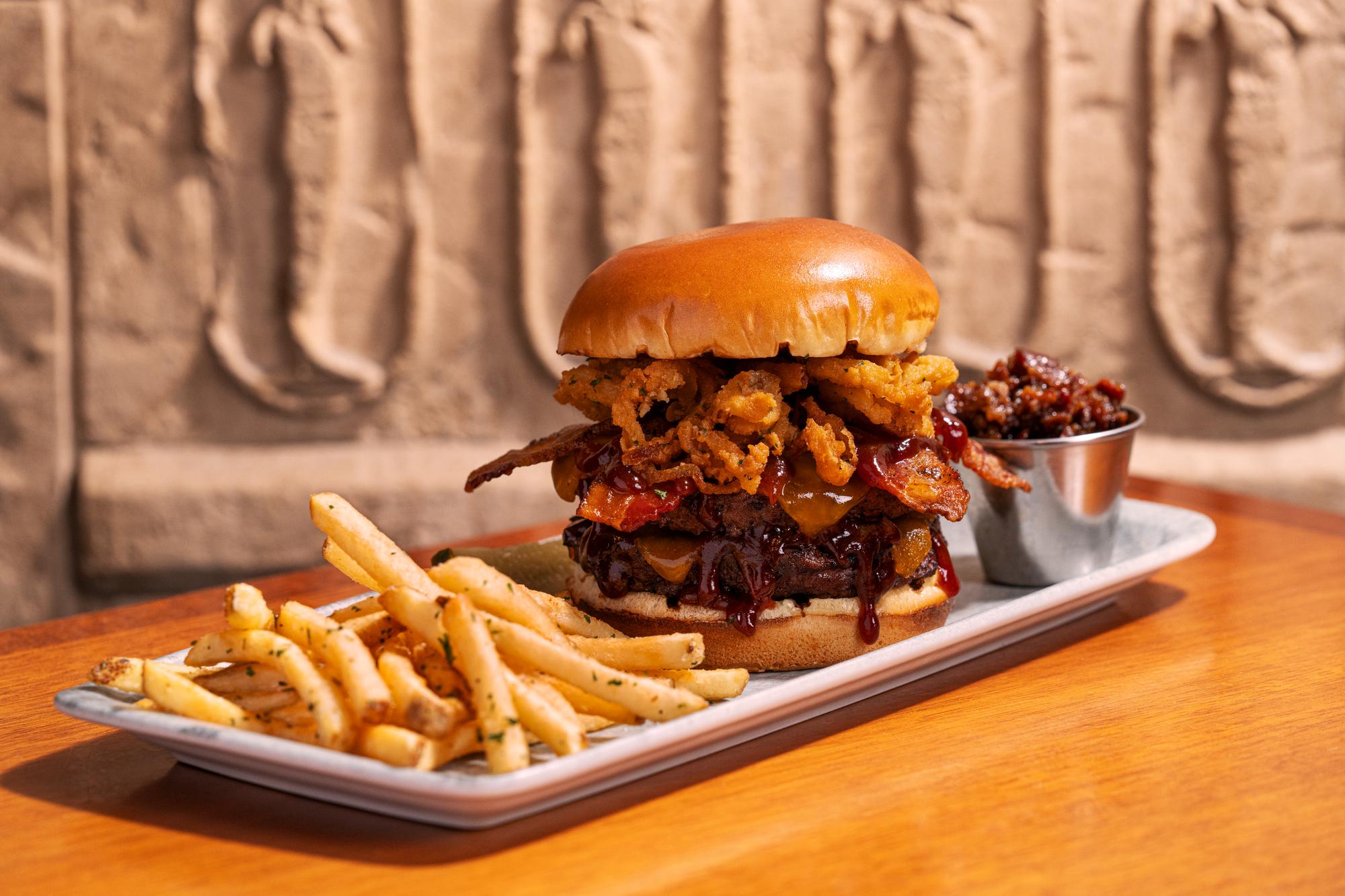 Sweet Baby Ray's BBQ, bacon jam, cheddar cheese, crispy onion strings
